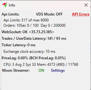 Displays data on exchange connection, API limits, Telegram integration, and terminal version.