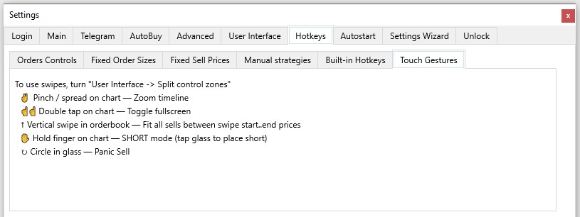At the top of the tab is a block of tabs: Orders Controls, Fixed Order Sizes, Fixed Sell Prices, Manual Strategies, Built-in Hotkeys and Touch Gestures.