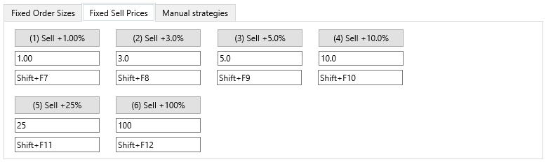 On the Fixed Sell Prices tab, you can configure settings for each of the fixed Sell buttons: the Sell Price (Take Profit level) and the hotkey combination to select the desired fixed Sell button.