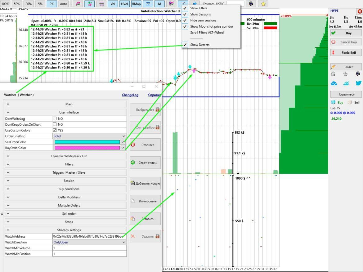 In the Moonbot terminal connected to spot or futures on the Hyperliquid exchange, you can create a special Watcher strategy which, once launched, can automatically monitor specified trading addresses and place arrow markers on the chart based on that address’s activity (an upward arrow — opening a long or closing a short, a downward arrow — opening a short or closing a long).