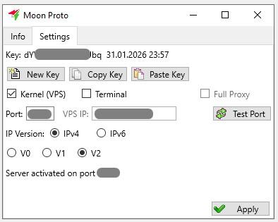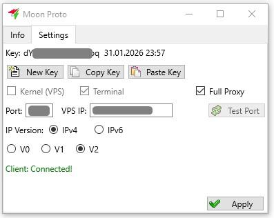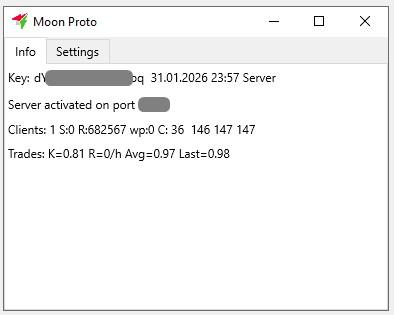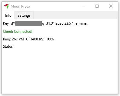 As a result, if everything is configured correctly, the settings in the Moon Proto window on the Settings and Info tabs on the Client side will look as follows:
