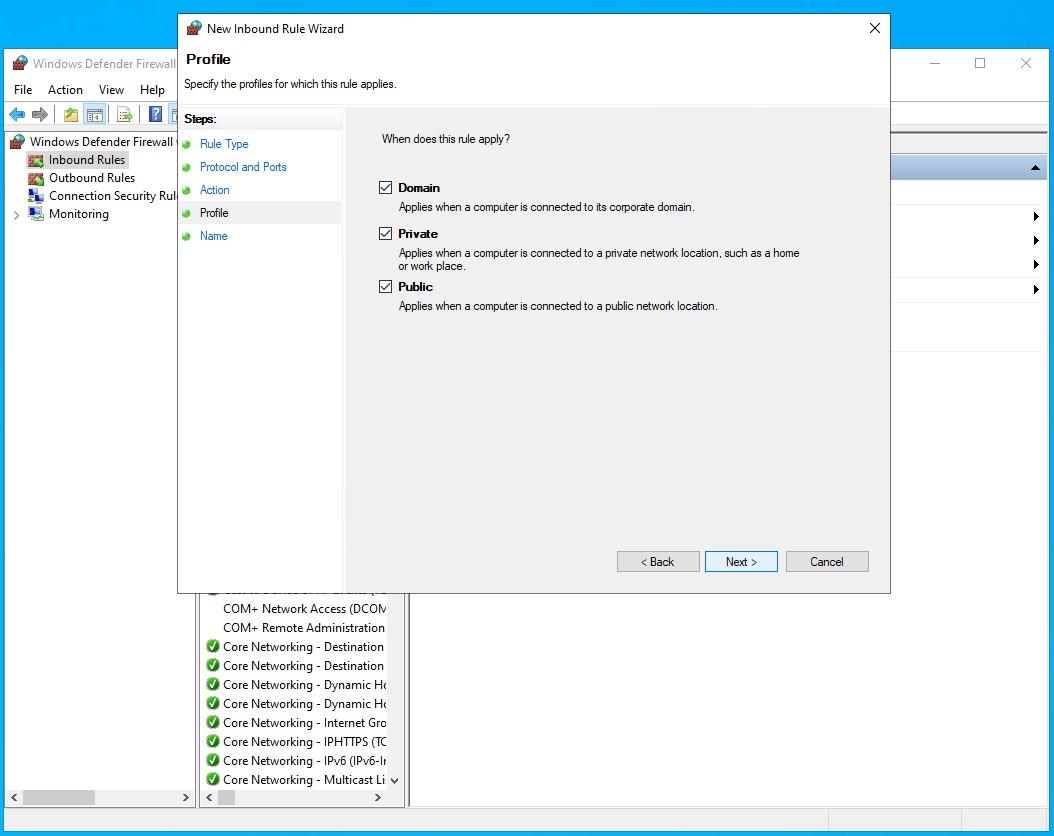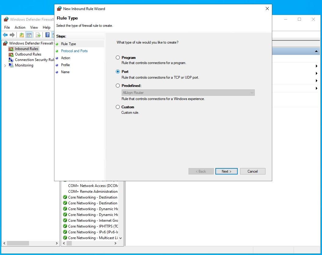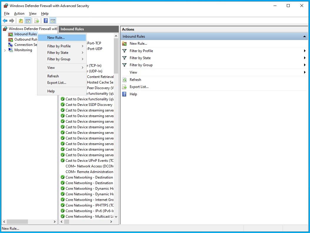 In the opened window, in the left panel click Inbound Rules, then right-click to open the context menu and select New Rule… — the New Inbound Rule Wizard window will open: