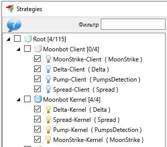 • on the local computer in Moonbot Client: only strategies without auto-buy AutoBuy=NO — when activated, a yellow indicator light appears, meaning these are detection-only strategies.
