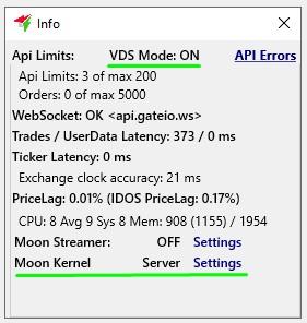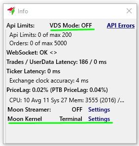 And the Info window will display: VDS Mode: OFF and Moon Terminal Settings, which means that VDS mode is disabled and the client-side functionality of Moon Kernel is connected.