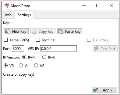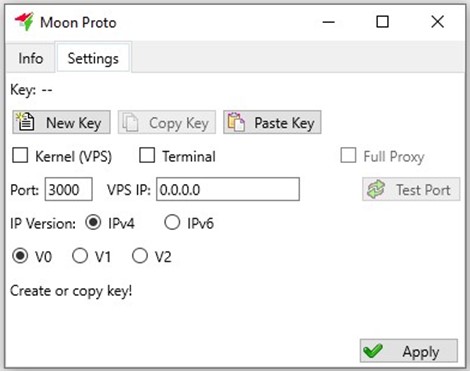 8. Click the Copy Key button to copy it to the clipboard. The key can be saved in a text file or immediately pasted into the Moon Proto window on the Client (local computer).