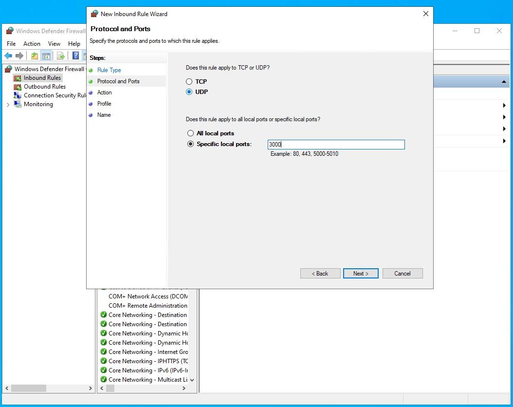 Then select the UDP option and enter a free UDP port number that you plan to open in the Specific local ports field, for example 3000, and click Next: