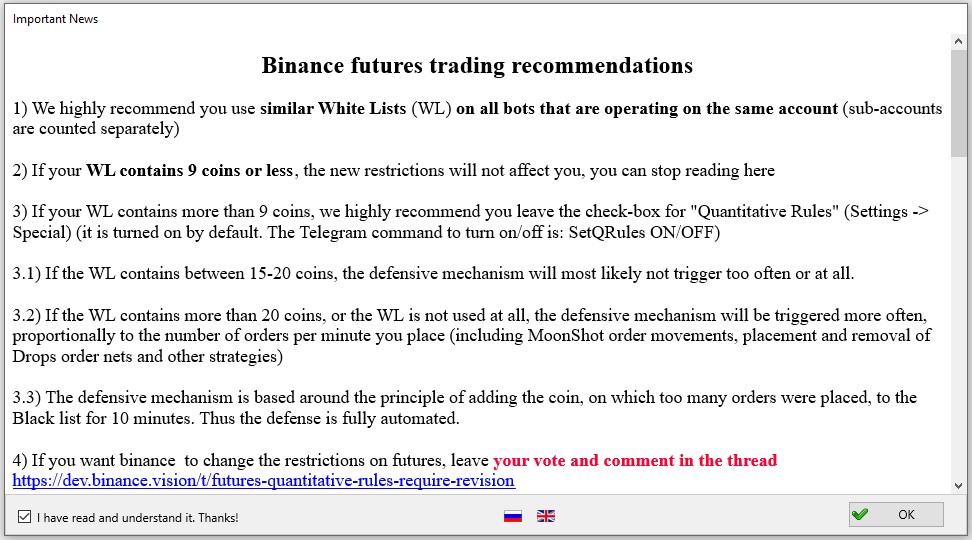 3) If your WL contains more than 9 coins, we highly recommend you leave the check-box for "Quantitative Rules" (Settings -> Advanced -> Engine Settings) it is turned on by default. The Telegram command to turn on/off is: SetQRules ON/OFF)