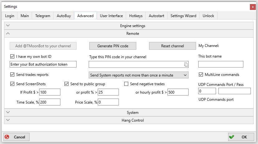 A text message will appear in Telegram for every result (profit or loss), and a screenshot will be sent only if the profit conditions you configured are met (Settings → Advanced → Remote).