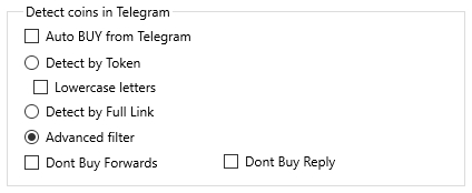 If the Auto BUY from Telegram checkbox is enabled, automatic buying will be executed using the terminal’s main settings when a coin is detected in messages from your selected Telegram channels.