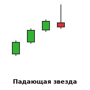 A candlestick with a small body at the bottom and a long upper shadow (2–3 times longer than the body). Appears at the end of an uptrend and signals a potential downward reversal. Buyers tried to push the price higher, but sellers rejected the move and returned the price to the opening level.