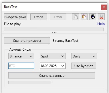 In the lower part of the BackTest window, you can download .bin files with historical data from various exchanges. To do this: