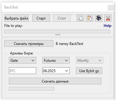 To work with Bybit archive data, you need to manually download an archive from the exchange website 🔗 https://public.bybit.com/ to your computer, for example ETHUSDT2026-02-07.csv.gz. Then, in the BackTest window, click the Use Bybit gz button, specify the path to this archive on your computer, and click Open. After that, a folder will be created in the BackTest directory with the coin name, year, and month, for example ETH-2026-02, containing .bin files such as Bybit_ETH_spot 07-02-2026.bin. You can then open this file in the BackTest window and replay it on the chart of that coin.