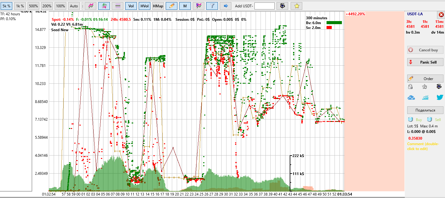 Click Start. Playback of historical trades from the selected file will begin, and the chart of the LA coin will open automatically. If this coin is no longer listed on the exchange, playback will always be performed on the ETH market; -