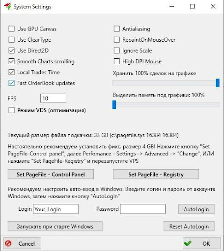 ☐ FPS – поле для задания значения частоты обновления графика в терминале. Для локального ПК от 20, для VDS от 10.