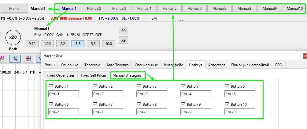 Для этого на вкладке Настройки Hotkeys следует выбрать вкладку Manual Strategies, установить галочки рядом с надписями Button 1 Button 10 и при необходимости в полях ниже добавить хоткеи для переключения на нужную стратегию.