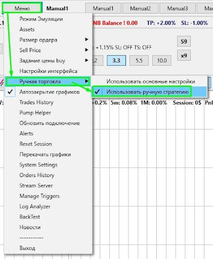Чтобы торговать с применением ручной стратегии, нужно сначала создать стратегию Manual, затем нужно выбрать в Меню Ручная торговля опцию Использовать ручную стратегию.