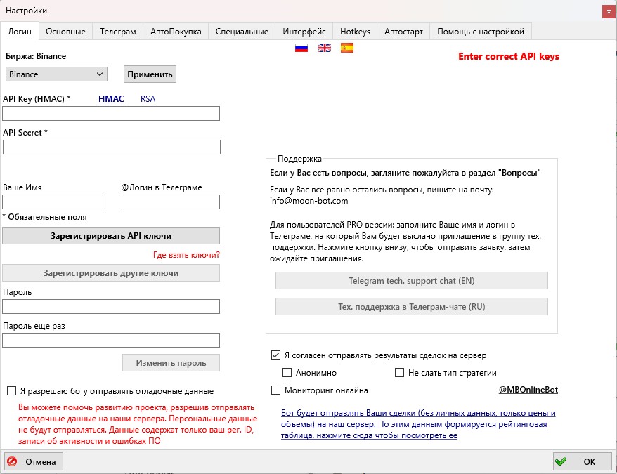 При первом запуске Moonbot необходимо ввести API-ключи, которые состоят из пары API Key и Secret Key: