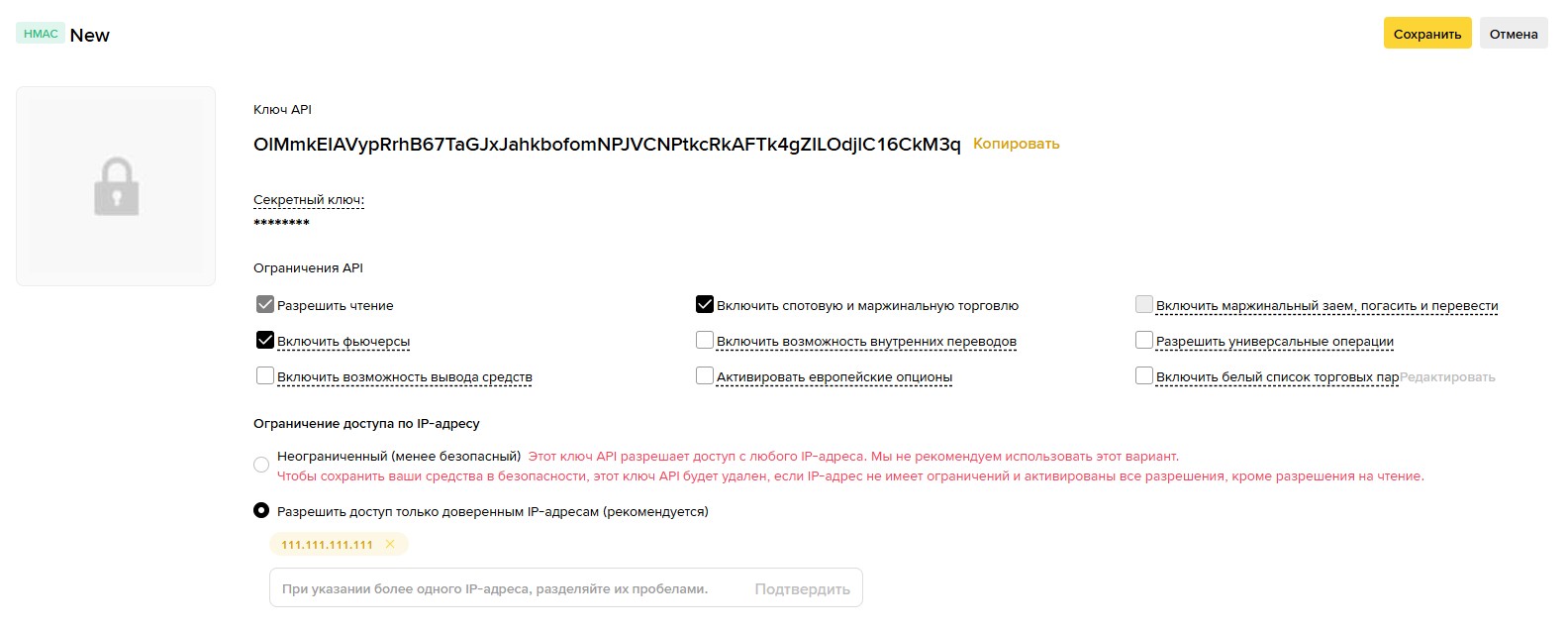 Если оставить активной опцию Неограниченный (менее безопасный), то срок действия API-ключей составит 90 дней, после чего потребуется вручную продлевать их или создавать заново. Кроме того, такая настройка позволяет доступ с любых IP-адресов, что значительно снижает безопасность.