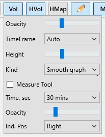 TimeFrame — задаёт интервал измерения объёма. Объём в любой момент времени считается как сумма сделок в выбранном интервале, при этом объёмы на покупку и продажу отображаются отдельно
