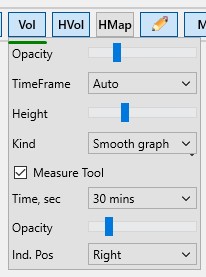 Time, sec — задаёт размер интервала измерения объёмов. Для выбора доступны следующие интервалы: Auto, 2 sec, 5 sec, 15 sec, 30 sec, 1 min, 3 mins, 5 mins, 15 mins, 30 mins, 60 mins. Например, при выборе значения 30 sec будут учитываться объёмы в диапазоне от -15 до +15 секунд от текущего положения курсора. Зона измерения подсвечивается синим цветом, а на шкале времени границы интервала отмечены двумя треугольниками