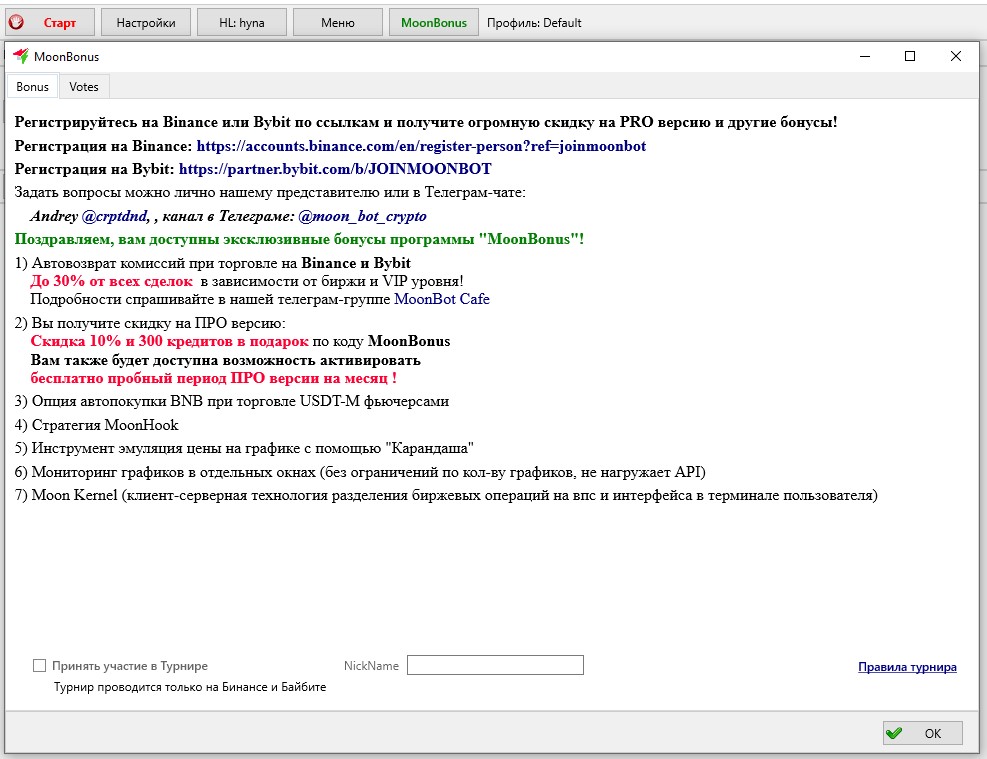 Автовозврат комиссий при торговле на биржах Binance и Bybit (до 30% от всех сделок в зависимости от биржи и Вашего VIP-уровня на ней). Подробности уточняйте в нашей Telegram-группе 📢 MoonBot Cafe https://t.me/MoonBotCandy.