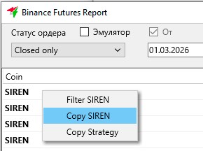 В поле Фильтр можно указать название монеты и получить список только по этой монете. Можно также указать название стратегии, чтобы увидеть данные только по этой стратегии.