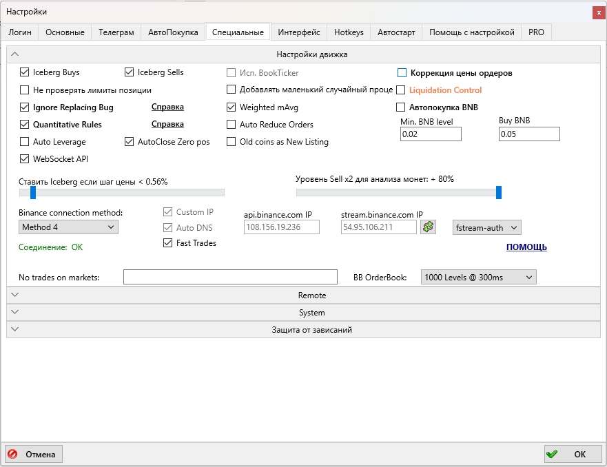 3. Если в Вашем БС больше 9 монет, настоятельно рекомендуется не снимать галочку защиты от новых правил Binance Quantitative Rules (НастройкиСпециальные). Эта опция включена по умолчанию. Команда для включения или отключения через Телеграм: SetQRules ON/OFF.