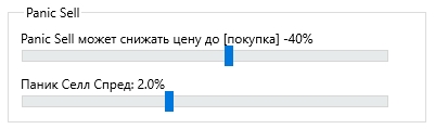 Panic Sell может снижать цену до [покупка] ± Х% ползунок с диапазоном настройки от –99% до +5%, который задает уровень в процентах от линии покупки, до которого терминалу будет разрешено опускать Sell ордер при нажатии кнопки Panic Sell на правой панеле управления главного окна. Обычно рекомендуется устанавливать ползунок в среднее положение на –40%, чтобы дать максимальную свободу функционалу Panic Sell для закрытия позиции при резком падении цены.