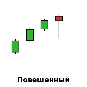 Свеча с маленьким телом в верхней части и длинной нижней тенью (в 2-3 раза длиннее тела). Внешне идентична Молоту, но появляется в конце восходящего движения и предупреждает о возможном развороте вниз. Несмотря на закрытие около максимумов, продавцы проявили заметную активность внутри периода.