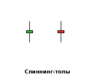 Свечи с маленькими телами и длинными тенями с обеих сторон, похожие на волчки. Отражают неопределённость рынка и равенство сил покупателей и продавцов. В трендовом движении обычно предшествуют продолжению тренда после короткой паузы.