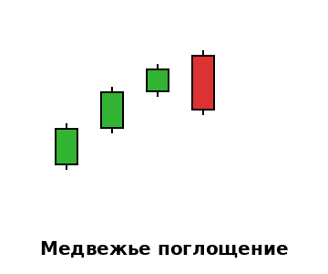 Двухсвечная модель, где вторая свеча полностью "поглощает" тело предыдущей. Появляется после восходящего движения и сигнализирует о возможном развороте вниз. Первая свеча зелёная, вторая красная открывается выше максимума первой и закрывается ниже её минимума — продавцы перехватили контроль у покупателей.
