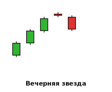 Трёхсвечная модель на вершине восходящего тренда. Первая свеча зелёная с длинным телом, вторая маленькая (любого цвета) с гэпом вверх (разрывом — открывается выше закрытия предыдущей), третья красная закрывается ниже середины первой свечи. Сигнализирует о развороте вниз — инициатива переходит от покупателей к продавцам.