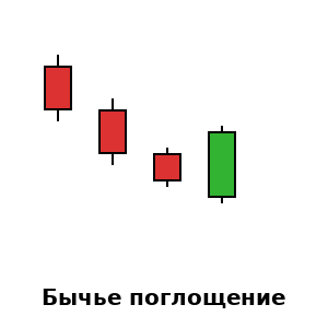 Двухсвечная модель, где вторая свеча полностью "поглощает" тело предыдущей. Появляется после нисходящего движения и сигнализирует о возможном развороте вверх. Первая свеча красная, вторая зелёная открывается ниже минимума первой и закрывается выше её максимума — покупатели перехватили контроль у продавцов.