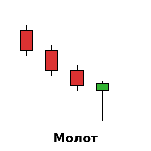 Свеча с маленьким телом в верхней части и длинной нижней тенью (в 2-3 раза длиннее тела). Появляется в конце нисходящего движения и сигнализирует о возможном развороте вверх. Длинная нижняя тень показывает, что продавцы толкали цену вниз, но покупатели смогли вернуть её к уровням открытия.