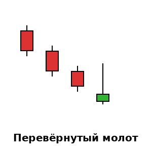 Свеча с маленьким телом в нижней части и длинной верхней тенью (в 2-3 раза длиннее тела). Появляется в конце нисходящего движения и сигнализирует о возможном развороте вверх. Покупатели пытались поднять цену, встретили сопротивление, но сама попытка атаки указывает на ослабление продавцов.